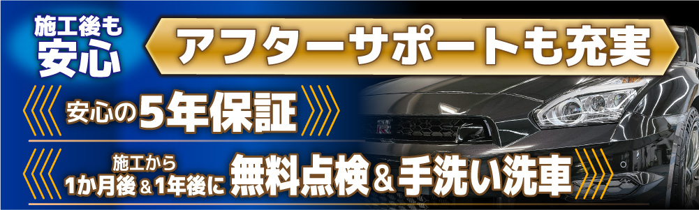 5年保証 万が一、期間内に当店の施工不良によりフィルム剝れがあった場合は、無料で再施工させていただきます。 |